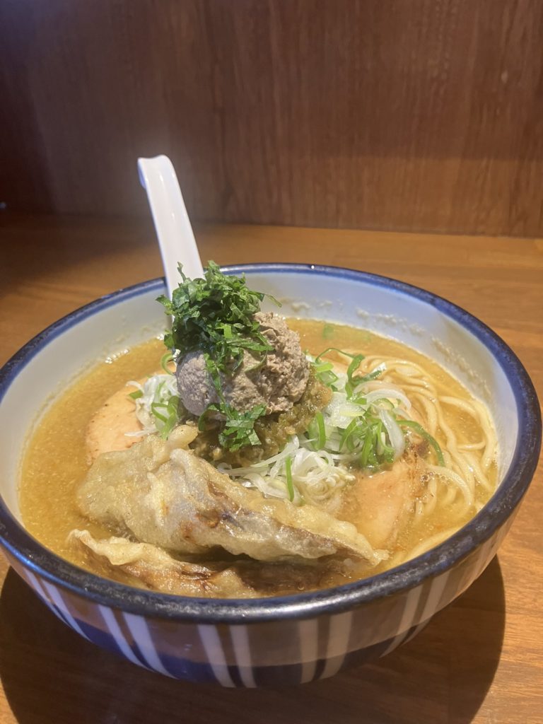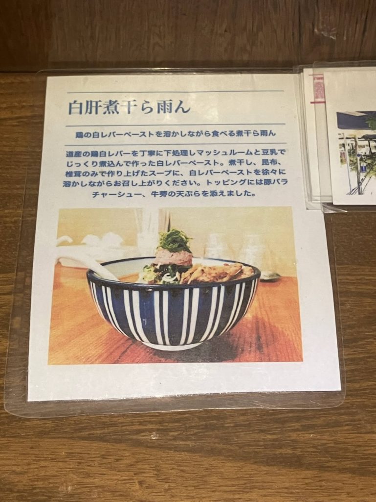そんな中で出会った「雨は、やさしく」。なんとも詩的な店名ですよね。今回食べたのは「白肝煮干(味噌)」という一杯です。