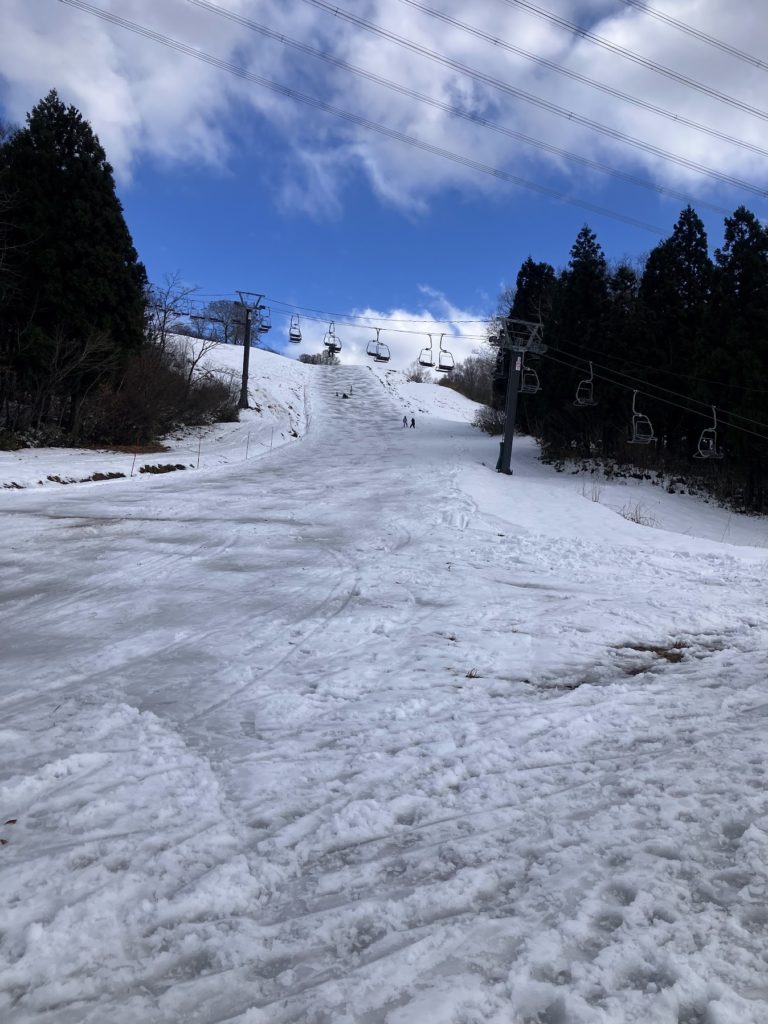 麓は雨でも、山上は雪!リフト待ちもなく、この時期にこれだけの斜面を滑れるのは最高です。